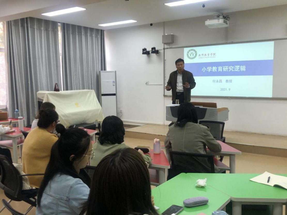 10月7日下午,best365英国体育在线院长付永昌教授在教七楼402为小学教育专业2021级硕士研究生作题为“小学教育研究逻辑”的学术报告,学院研究生秘书常燕燕老师和全体2021级硕士研究生参加报告会。