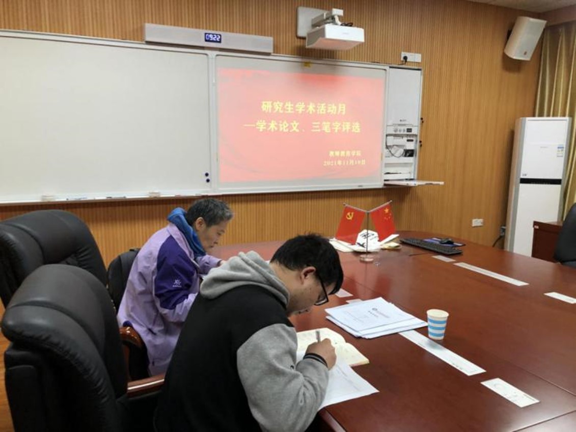 同时,三笔字(钢笔字、毛笔字、粉笔字)以及学术论文评选活动在教七楼301室举行。李文田、吴宏、刘建新等三位老师担任评委,针对各项作品进行了认真评审。