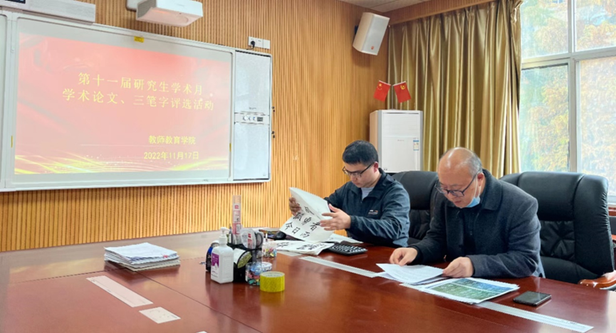 与此同时,李文田、刘建新老师在教七楼301室进行了“三笔字”和论文评选,两位老师对比同学们的粉笔字、硬笔字及毛笔字的不同特点,认真评选大家参赛作品。