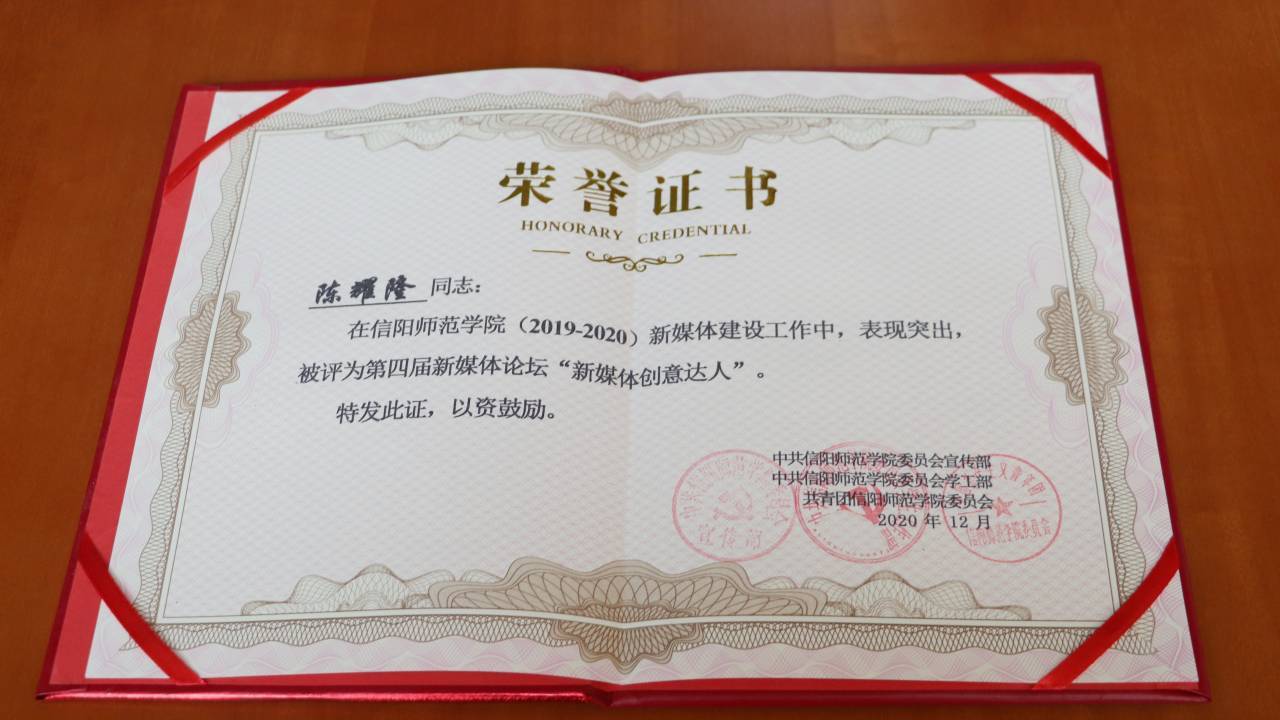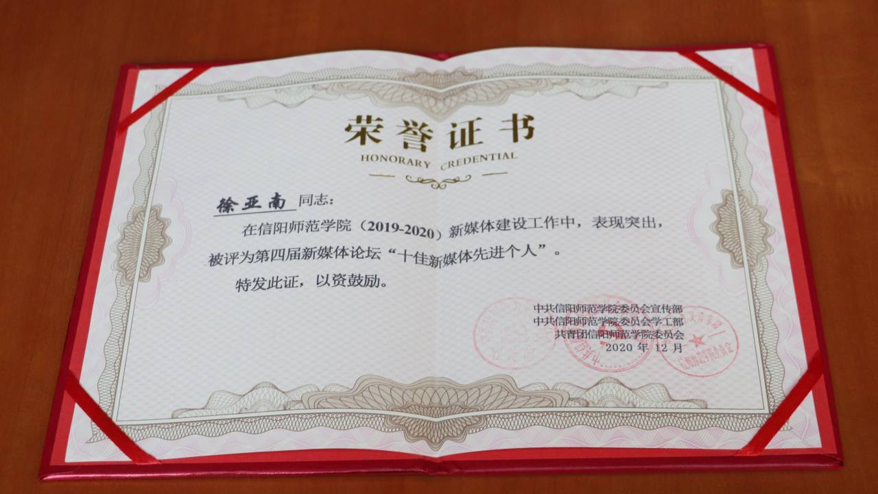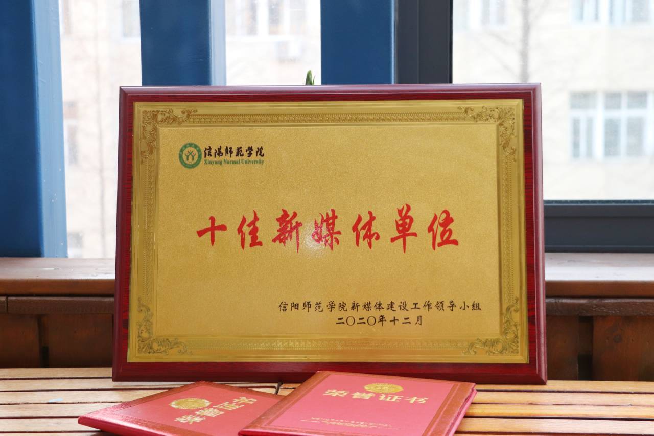 12月19日,信阳师范学院第四届新媒体论坛暨颁奖典礼在逸夫楼321会议室顺利举行,best365官网在本次颁奖典礼上收获颇丰。本院融媒体工作室荣获“十佳新媒体单位”奖项、指导老师徐亚南荣获“先进个人”称号、融媒体工作室主任陈耀隆荣获“创意达人”称号。