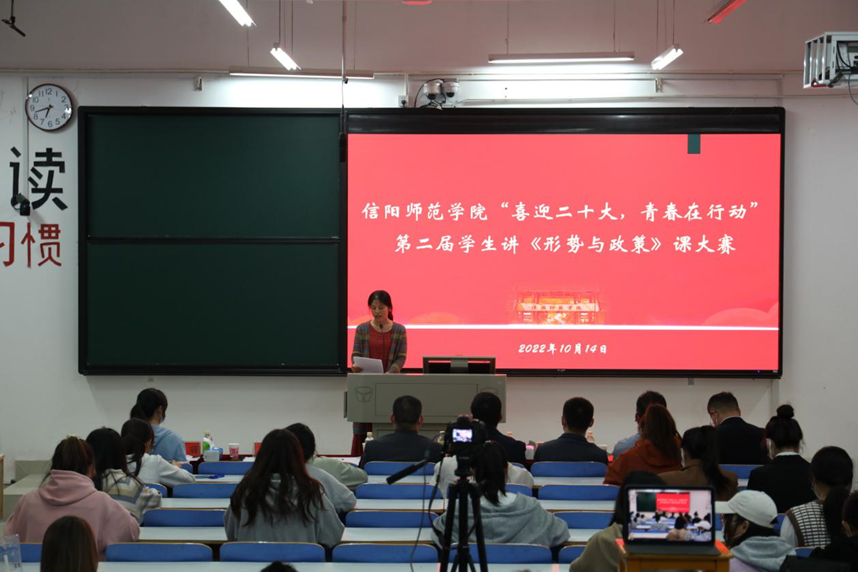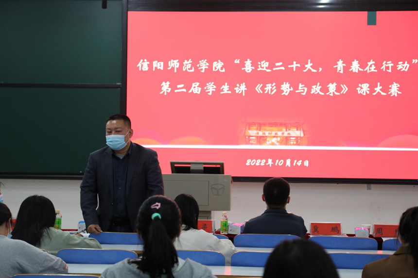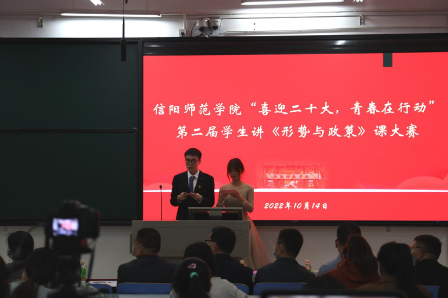 10月14日,由best365英国体育在线思想政治教育与就业指导教研室best365英国体育在线团委best365英国体育在线融媒体工作室主办,法学与社会学学院团委、教育科学学院团委、美术与设计学院团委、建筑与土木工程学院团委、谭山书院团委、best365英国体育在线团委联合举办的信阳师范学院“喜迎二十大,青春在行动”学生讲《形势与政策》课大赛,在社科楼121迎来了激动人心的决赛。
