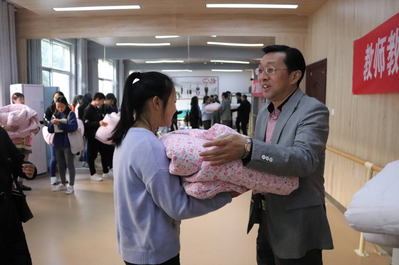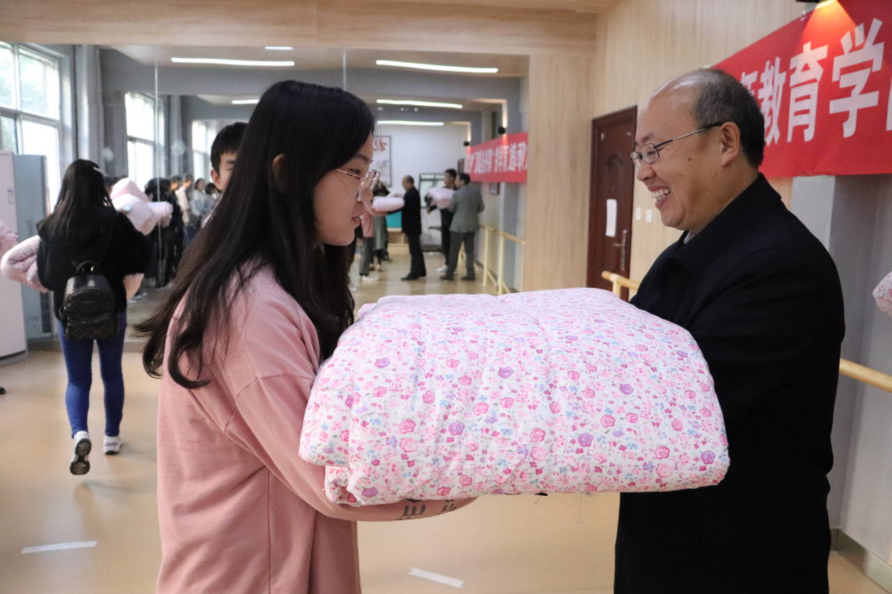 发放仪式过程中,潘登详细为同学们介绍了学校“奖、贷、助、补、减”五位一体资助体系,亲切慰问了学生学习、生活、寝宿情况。他表示,为深化“不忘初心、牢记使命”主题教育,切实解决学生生活问题,学院坚持以送棉被、送温暖、送爱心的方式践行初心与使命。他对在场学生提出三点期望:一是常怀感恩之心,学会以感恩之心接物待人;二是努力学习科学文化知识、提高自身综合素质,不断完善、发展自身;三是希望学生秉持艰苦奋斗、积极奉献的良好精神,为做优秀的小学教育全科教师而不断奋斗。在场学生纷纷表示要满怀感恩之心,树立远大理想,以实际行动和优异成绩回报学校给予的温暖。