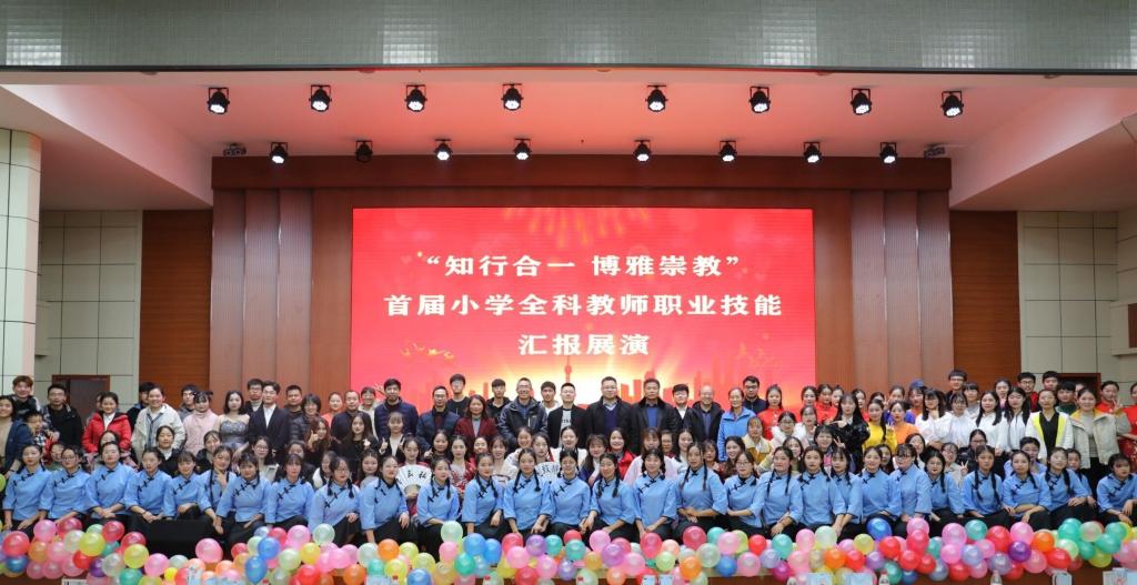 为深入贯彻全国教育工作大会和《中共中央国务院关于全面深化新时代教师队伍建设改革的意见》精神,大力落实国家《教师教育振兴行动计划(2018-2022年)》要求,真正达到小学教师一专多能的培养目标。12月13日晚,由best365英国体育在线行知教育工作室、best365英国体育在线团委主办的“知行合一,博雅崇教”首届小学全科教师职业技能汇报展演在逸夫楼报告厅举行。信阳师范学院教务处朱明老师、校团委张锐老师、best365英国体育在线付永昌院长及全体老师与四百多名学生共同观看本次展演。