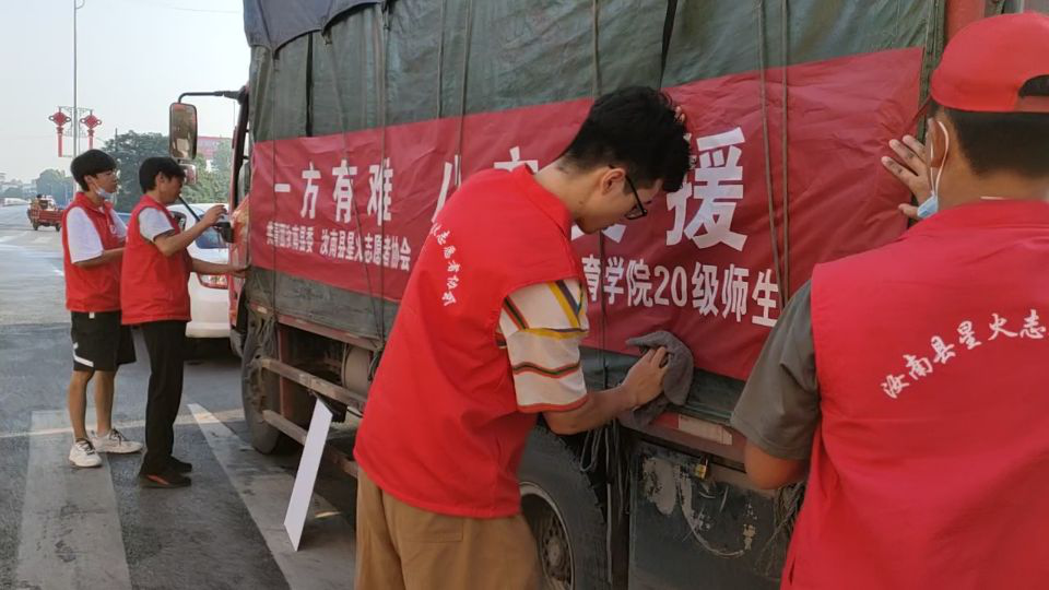 7月28日下午,爱心募捐结束后,20级本科六班团支书吴华政与其家乡所在地汝南县团委积极沟通,县团委对此表示强烈支持,随即与其下辖的星火志愿服务队对接并捐出5000元与小教学子一同驰援河南新乡。7月29日,接到河南新乡红十字会反馈,由于集中安置点灾民缺乏米面油等物资,生活质量和医疗物资都无法保障,决定购买170袋面粉,120桶油和7箱医疗物品。7月30日,学院学生代表吴华政,康思源跟随星火志愿服务队的物资车队一同前往河南新乡搬运救援物资,慰问救灾人民。返回时,新乡人民对其表示由衷的感谢。