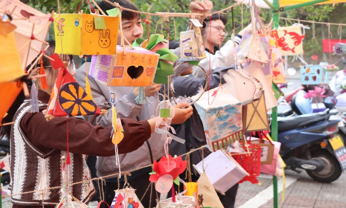 活动在八餐小广场举行,活动伊始,志愿者介绍了花灯的传说,极大地调动了大家的积极性。随后,学生们发挥自己的想象力,从提供的废旧物品中挑选自己喜欢的材料进行创作。选图、构思、裁剪、粘贴......学生们互相交流研究,相互分工制作灯笼,通过一步步的搭建、固定、组装,在欢声笑语中,一盏盏形状多样、色彩绚丽的花灯在学生手中诞生了,从一盏盏灯前走过,传统文化的气息扑面而来。同学们都兴高采烈地拿着花灯进行拍照,场面温馨而幸福。随后,best365官网组织评委进行投票,评委们以丝带作为票根,选择自己满意的花灯进行现场投票,经过工作人员认真核查,最终确定曹佳琳、建连芳二人获得一等奖,史瑞丽等六人获得二等奖,付嘉茵等九人获得三等奖。