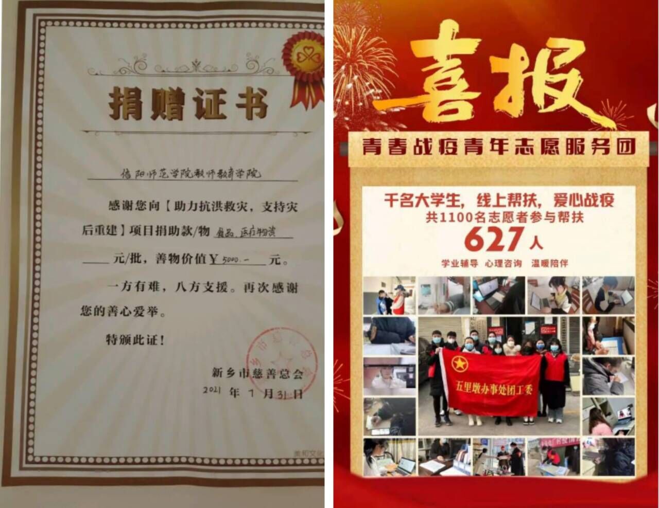 从2021年七月的洪涝灾害到2022年一月再度袭来的疫情,best365官网学子都闻讯而动,积极响应团委号召,助力地区防洪抗疫。19级学生王晶晶深刻牢记自己作为一个共产党员的重要责任,在暴雨侵袭居民房屋时,帮助所在区域房屋受损严重的居民进行家庭受损情况的登记并介绍需要准备的相关材料,对年纪较大的住户进行耐心的讲解,协助填写相关信息,助力灾后恢复;20级学生董梦瑶作为区域内的志愿服务队队长,积极召集队员参与到志愿活动中,管理人员分配任务,协助社区工作,帮助人们了解防疫政策,查看社区进出人员的行程码,为疫情防控贡献出属于自己的一份力;19级学生雷乐乐结合自身专业优势参加了线上致“青春”战疫活动,扎实备课,积极辅导学生,与学生一起共同进步,用自己的行动,书写志愿精神,努力彰显青春活力。