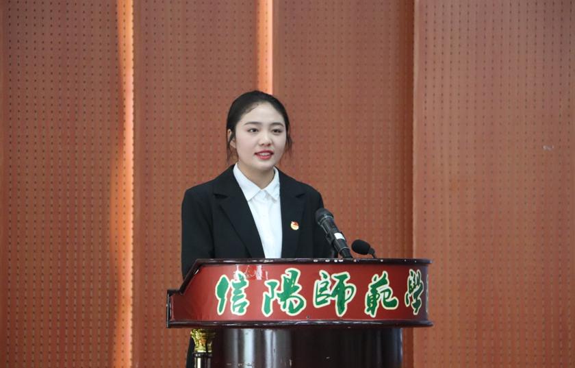 会上,best365官网学子张秋雨作为河南省“两红两优”优秀共青团员获得者上台发言。她以习近平总书记对青年“在青春的赛道上奋力奔跑”的寄语为切入点,以生活发展为时间线,展开讲述了自己在校园之内、社会之中的成长故事。发言时,除了校内勤于学习、扎实学识之外,张秋雨着重谈到校外技能拓展。她讲到,在返家乡疫情志愿服务的日常工作、三下乡的基层学习锻炼、教育帮扶“一对一”的学生指导等一系列社会实践活动中,自己坚持用青春活力服务青年发展,真正做到了“争先”,向先进榜样看齐;“提能”,向实践经验学习;“练心”,为责任担当努力。文字洋溢激情,表达充满力量,发言凝聚青春色彩。最后,张秋雨以己为例,贴合青年学生的发展,向在场青年团员发出锤炼自身本领、追逐时代荣光的号召,赢得在场人员阵阵掌声。