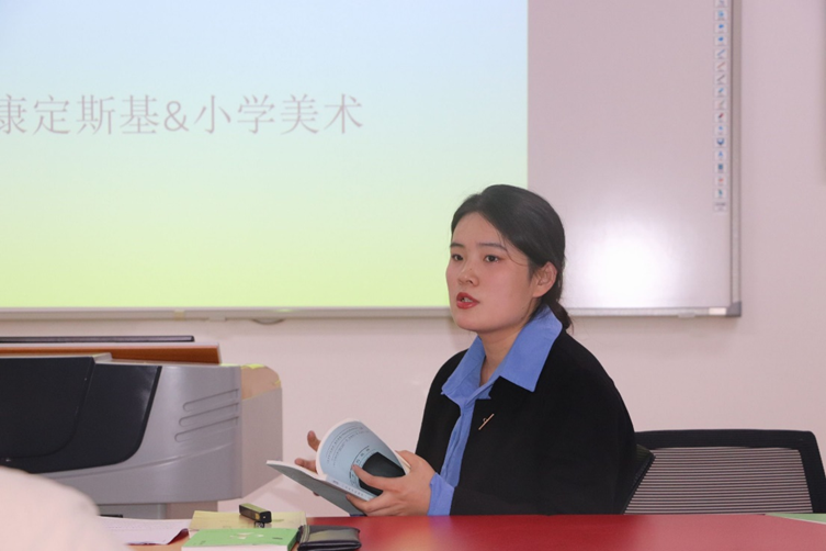 康文慧将费德门教授的“欣赏艺术作品的方法程序”引入到本期读书会中,从作者介绍、作品特点、作品理解、作品风格的转换四个角度对《艺术中的精神》进行讲述。她通过图片欣赏与书本的结合、作者经历与艺术精神的结合,将书中的内容呈现出来,提出了要透过作品看到本质,美无对错,重要的是发自内心的观点。此外,针对best365官网的教学特色,她提出了康定斯基与小学美术的结合,将艺术融入教育,在欣赏艺术中达到美育的效果。在答疑交流环节中,李清政同学就该书提出了辩证看问题、终身学习等观点,读书会在思想碰撞中营造了良好氛围。会议最后,徐亚南作总结发言,她向与会人员提出了坚持读书,着眼于自身的成长,让刻苦读书成为强心剂、美容剂,为青春发展注入强大动力的建议。