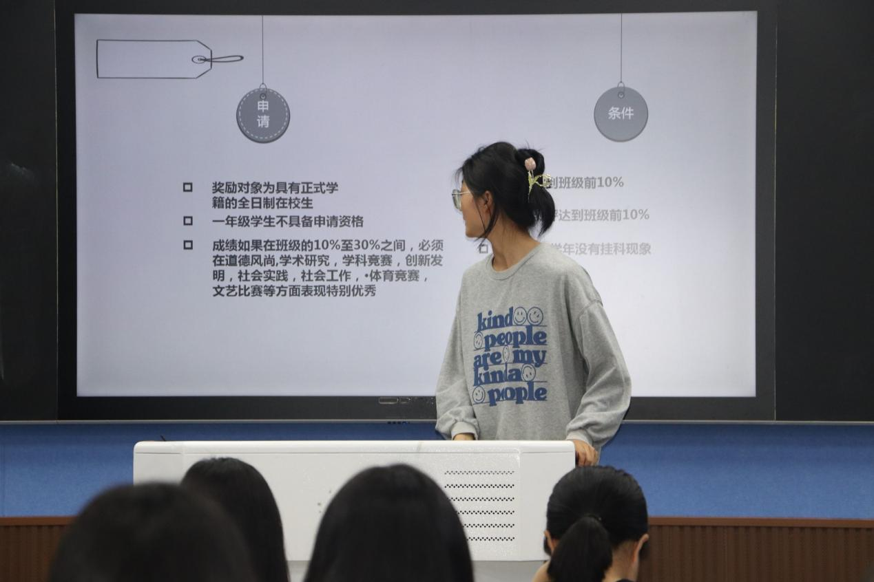 李欣怡就本次活动的流程、背景、目的和要求进行了介绍。她从资助范围、资助标准、申请条件、申请时间等方面分别详细讲解了国家奖学金、国家励志奖学金、国家助学金、校级奖学金的政策要求。通过系统的理论知识详解,为同学们后续申请相关资助奠定基础。李欣怡就同学们提出的相关问题做了一一解答,并鼓励同学们奋力学习,知恩在心,感恩于行。