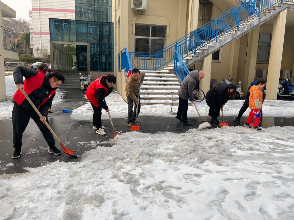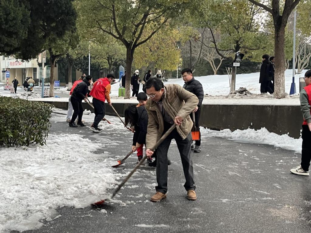 活动开始,大家带着各自的扫雪工具,兵分几路,分别清扫了教四、教六、教七前道路上以及外跨楼梯上的积雪。为了清扫干净主干道上的积雪,师生们有的用力铲,有的紧随扫,还有的负责把雪运送到路边,彼此默契合作,进展顺利。在大家的共同努力下,各主干道上的冰雪很快被铲除干净。为新学期学生上课开辟出一条通畅的道路。在潘书记的带领下,师生们不畏冬日的寒冷,清扫工作开展得热火朝天,为这个冬天增添了一份特殊的温暖。