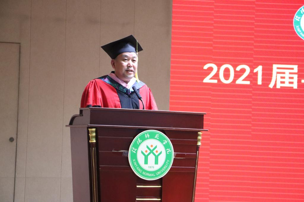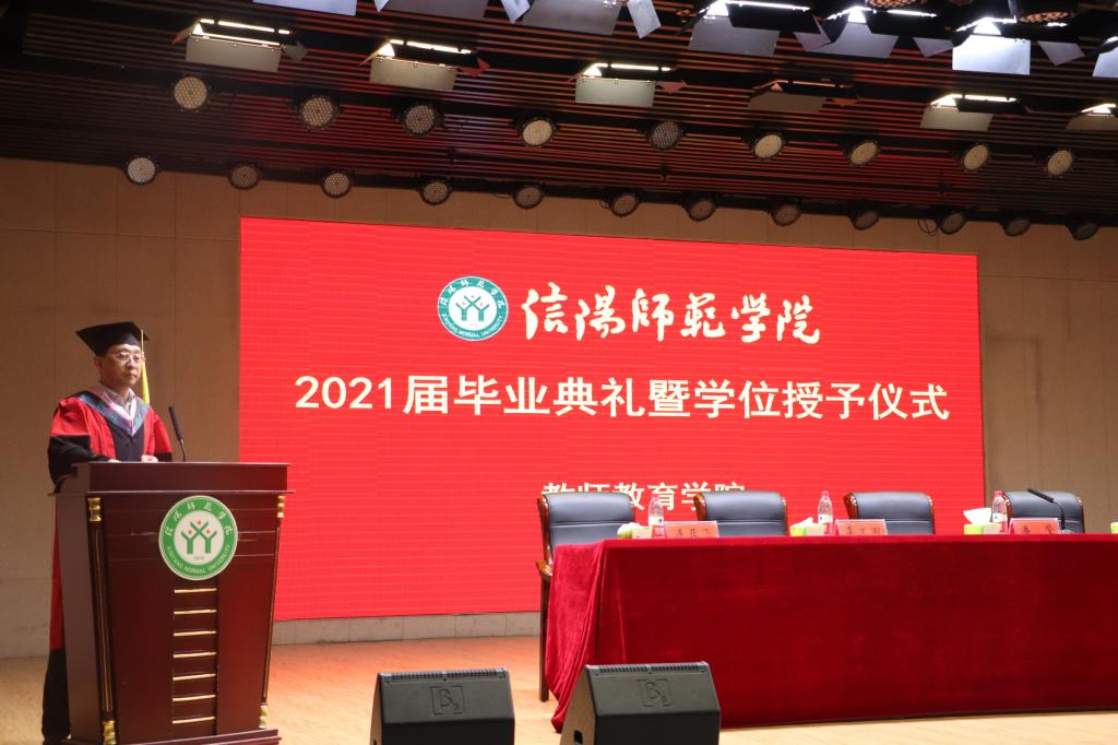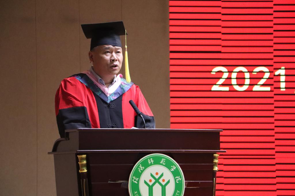 毕业典礼仪式在高亢嘹亮的国歌声中拉开序幕。首先,付永昌教授宣读了学校学位评定委员会关于授予best365英国体育在线189名2021届普通本科小学教育专业毕业生教育学学位的决定并发表致辞。他表示,2017年,怀揣赤子之心的学生和以红色筑梦为依托、立足大别山革命老区乡村教师培育的best365英国体育在线相拥而至。四年来,学生与学院同步伐、共命运,见证着彼此的点滴成长。在最后的离别之际,他向毕业生提出三点建议。第一,永葆初心、砥砺恒心,始终对教师怀有尊敬情怀。第二,天下大事、必作于细,扎实学识,做专业之才。第三,青年向上、国家向前,对未来职业道路充满期待,奋发向上。