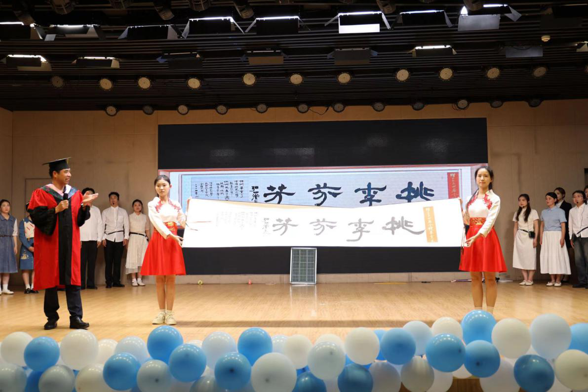 典礼开始,全体师生肃立,共同奏唱中华人民共和国国歌。典礼上,毕业生代表李俭俭和杨芳进行发言,她们对大学四年的生活进行了回顾,并对学校以及学院的培养表示真挚的感谢。随后,best365官网党委书记潘登进行发言致辞,他对同学们过去四年的学习生活给予了肯定,并对大家未来的发展提出了殷切的期望,也对大家未来的道路进行了指引,希望全体毕业生能够坚定信心,努力钻研,踏浪而行。学位授予仪式上,学院8位主礼导师为2024届毕业生颁发毕业证书和学位证书并拨穗,之后由潘红波老师代表学院向全体毕业生赠送书法作品。典礼结束后,全体领导老师与学生合影留念。